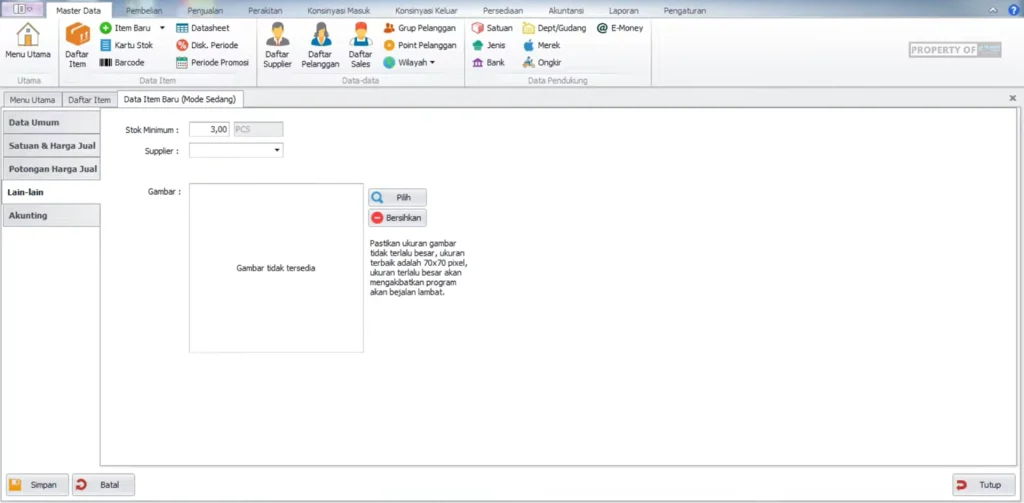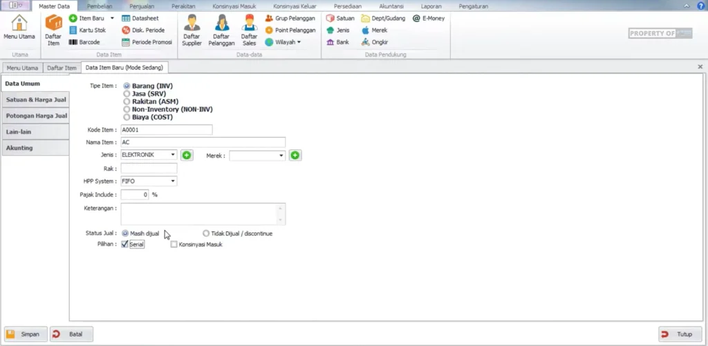 • Poin Penting: Khusus barang elektronik, fitur Serial Number wajib dicentang agar setiap unit barang memiliki nomor unik yang terlacak