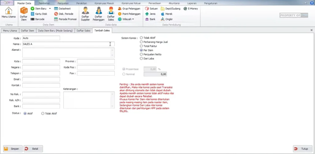 • Sub-fitur: Pengaturan komisi per item barang dan pembuatan daftar nama sales.