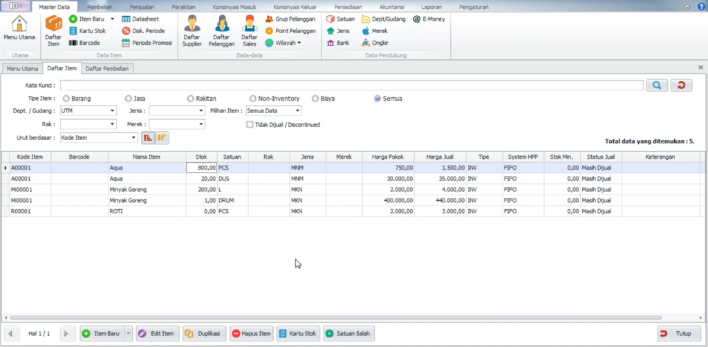 - Input Item Baru: Menambahkan produk seperti Aqua atau minyak goreng ke dalam sistem.