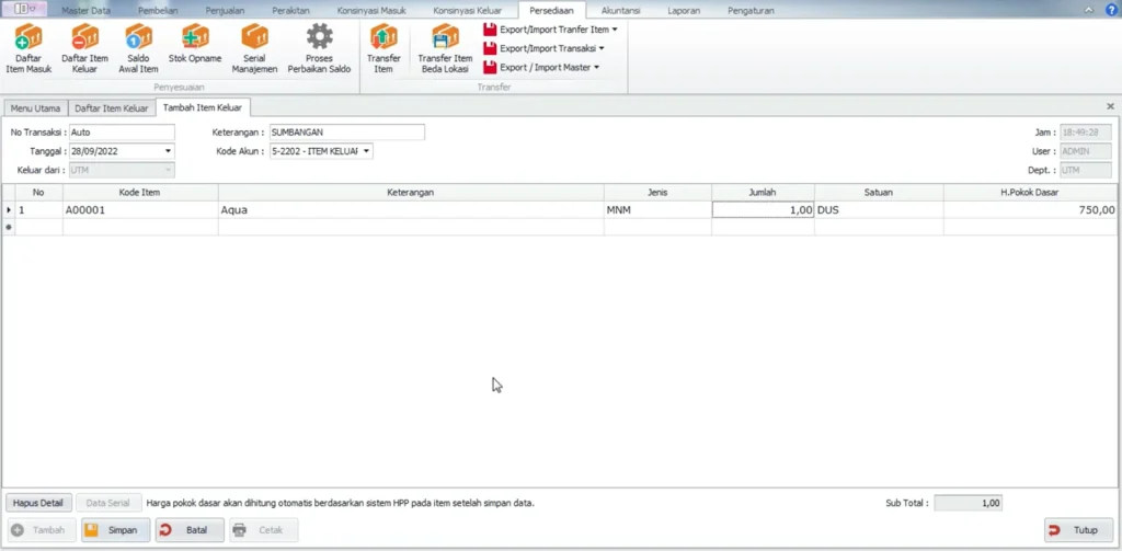 - Item Keluar: Mencatat stok yang berkurang karena rusak, hilang, dikonsumsi sendiri, atau diberikan sebagai sumbangan agar laporan laba rugi tetap akurat.